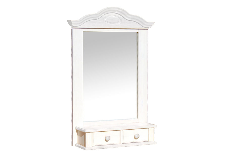 Полка-зеркало «Синди» (Sindy) из массива сосны. Состоит из зеркального полотна, вставленного в раму. Так же имеются 2 небольших ящика под хранение мелких предметов. Оснащено приспособлениями для вывешивания на стене.