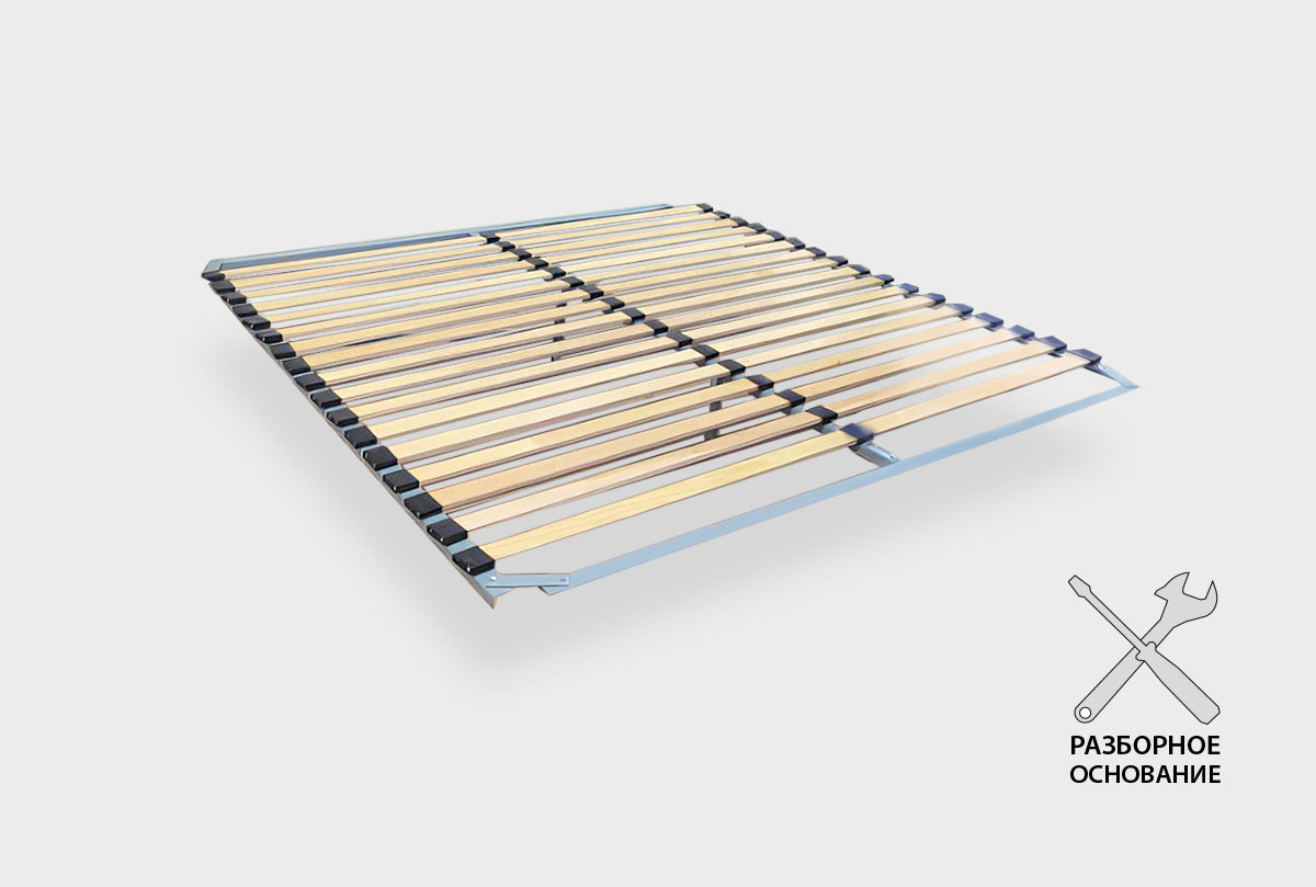 Основание с металлическим каркасом и эластичными ламелями из натуральной древесины расположены таким образом, чтобы обеспечить максимальный оздоровительный эффект. Основание предназначено для применения в комплекте с ортопедическим матрасом, так как улучшает ортопедические свойства матраса и увеличивает срок его эксплуатации за счет частичного снижения нагрузки на матрас (пружинящего эффекта), а мягкие вставки и накладки не позволят кровати скрипеть, и обеспечат сохранность при транспортировке.