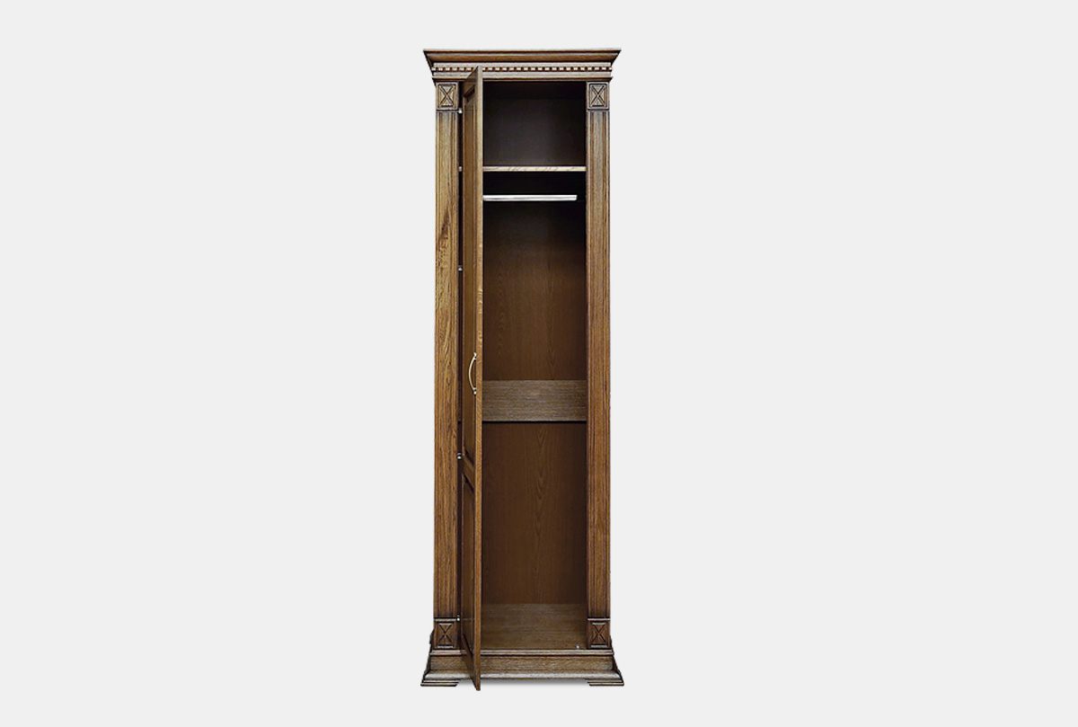 Благодаря своей ширине однодверный шкаф из коллекции «Верди Люкс» подойдет даже для небольшого помещения. Несмотря на это, он очень вместительный и имеет продуманное функциональное наполнение: штангу для одежды и верхнюю полку. Шкаф подойдет не только для гостиной и спальни, но и для прихожей: на дно Вы можете поставить коробки с обувью.