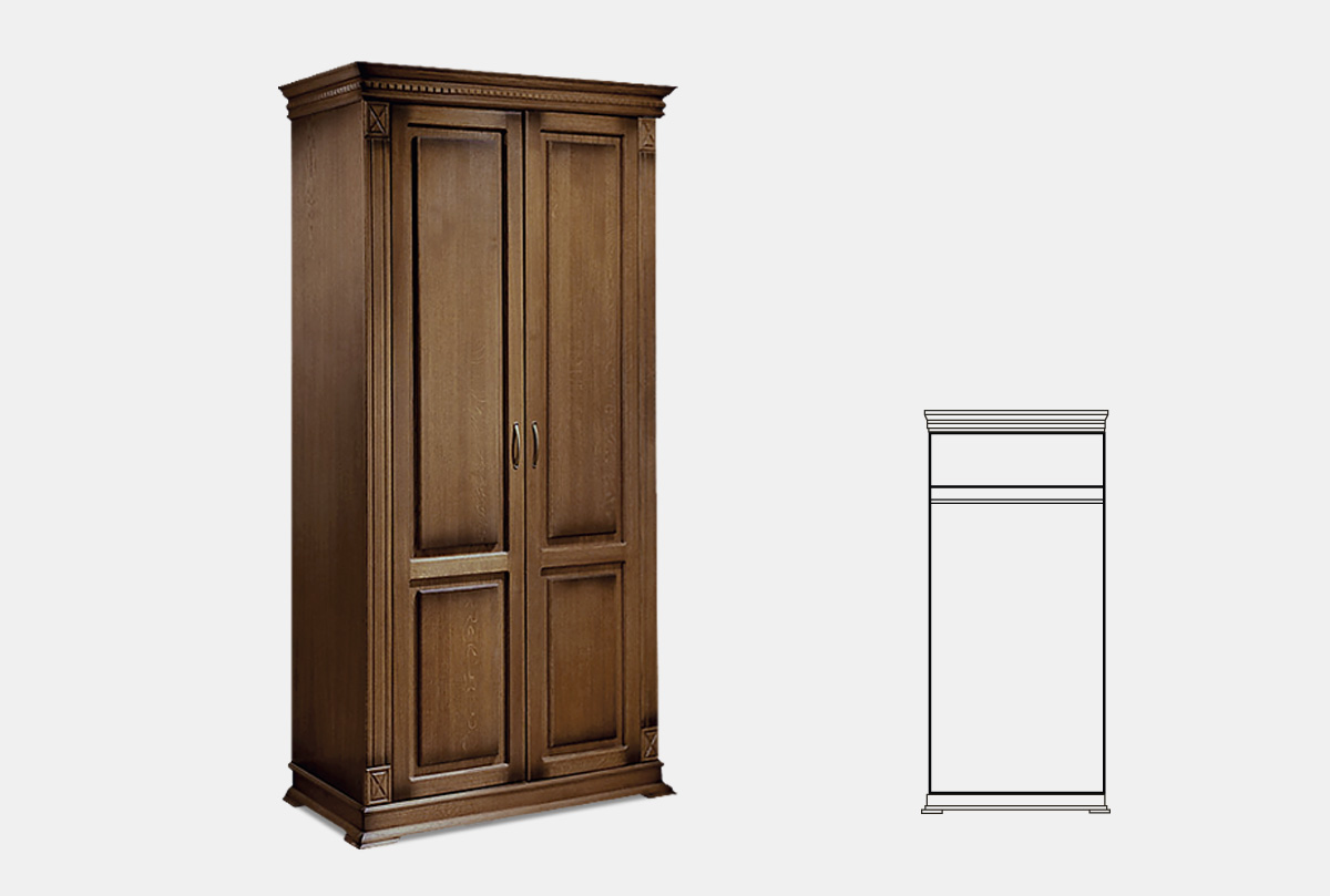 Двухдверный шкаф из коллекции «Верди Люкс» подойдет даже для небольшой квартиры. Он очень вместительный и имеет продуманное функциональное наполнение: штангу для одежды и верхнюю полку. Шкаф подойдет как для гостиной и спальни – в нем Вы сможете хранить личные вещи и постельное белье, так и для прихожей – на его дно можно поставить коробки с обувью, а на верхней полке хранить головные уборы.