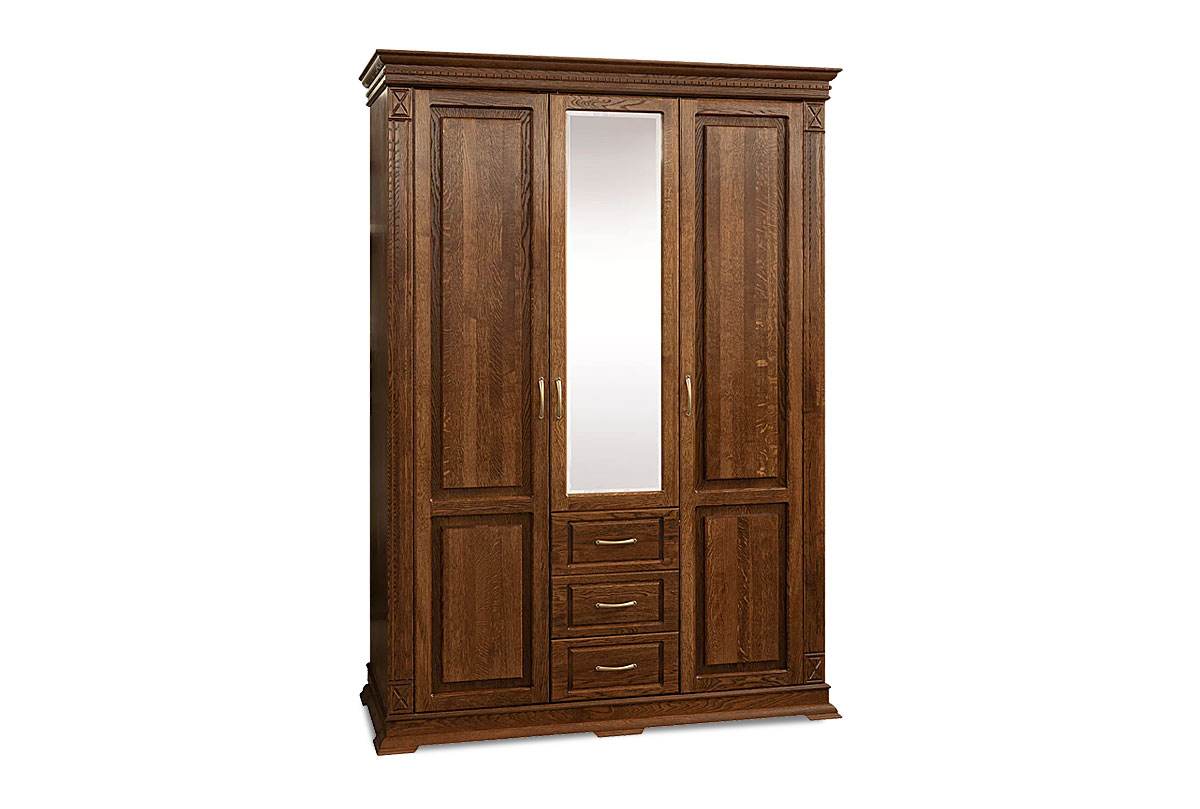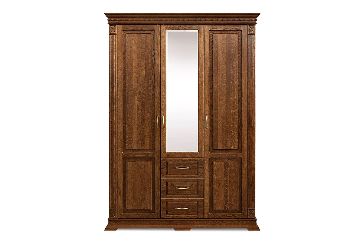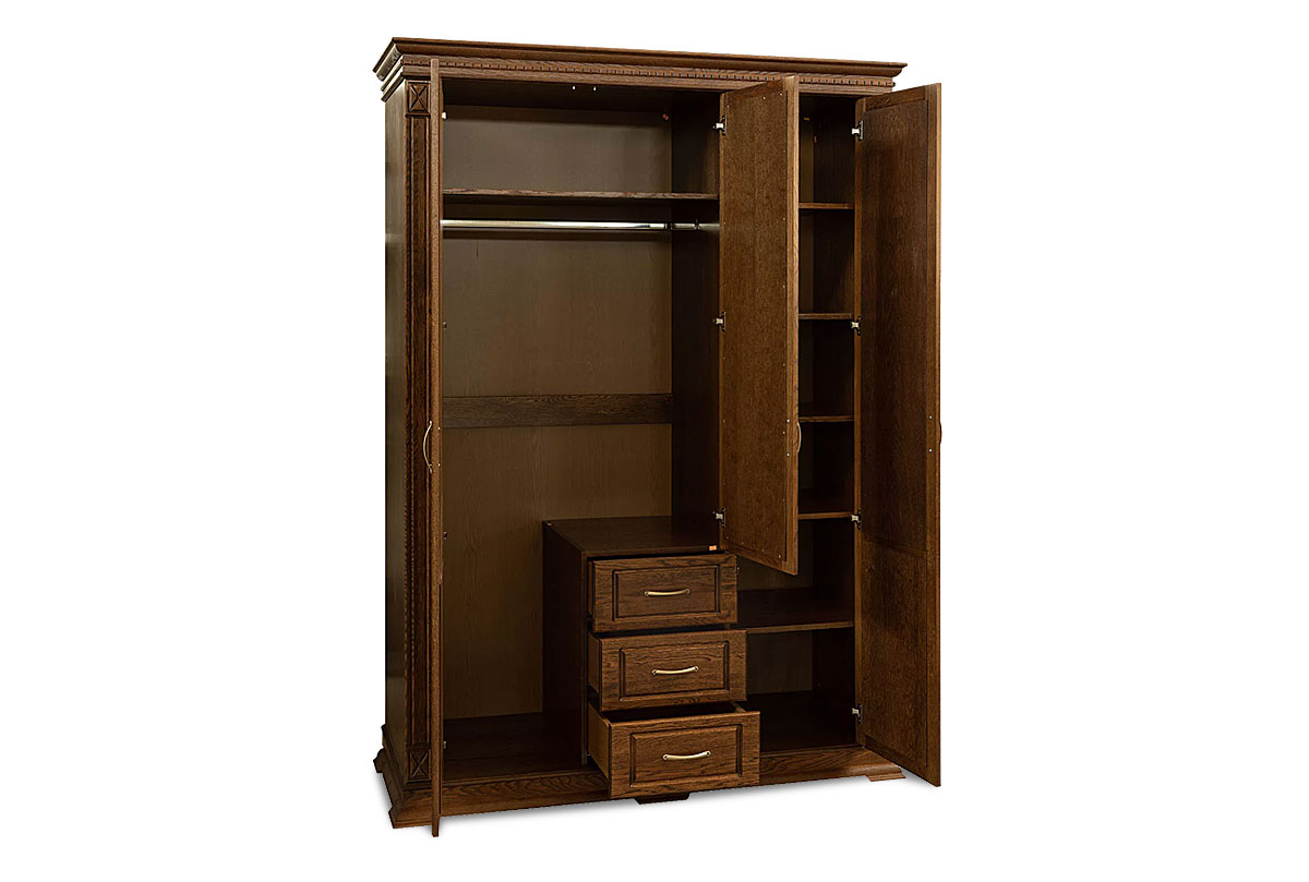 Трехдверный шкаф из коллекции «Верди Люкс» - это идеальный баланс красоты и эргономичности. Утонченность классики представлена в виде фигурного цоколя, резных пилястр и благородных цветов крашения «слоновая кость» и «дуб рустикаль», которые подчеркивают природную красоту дерева. Внутреннее наполнение в виде выдвижных ящиков, полок и штанги для одежды обеспечивают комфорт эксплуатации. Украшение шкафа – зеркало с фацетом, который создает дополнительную игру света.