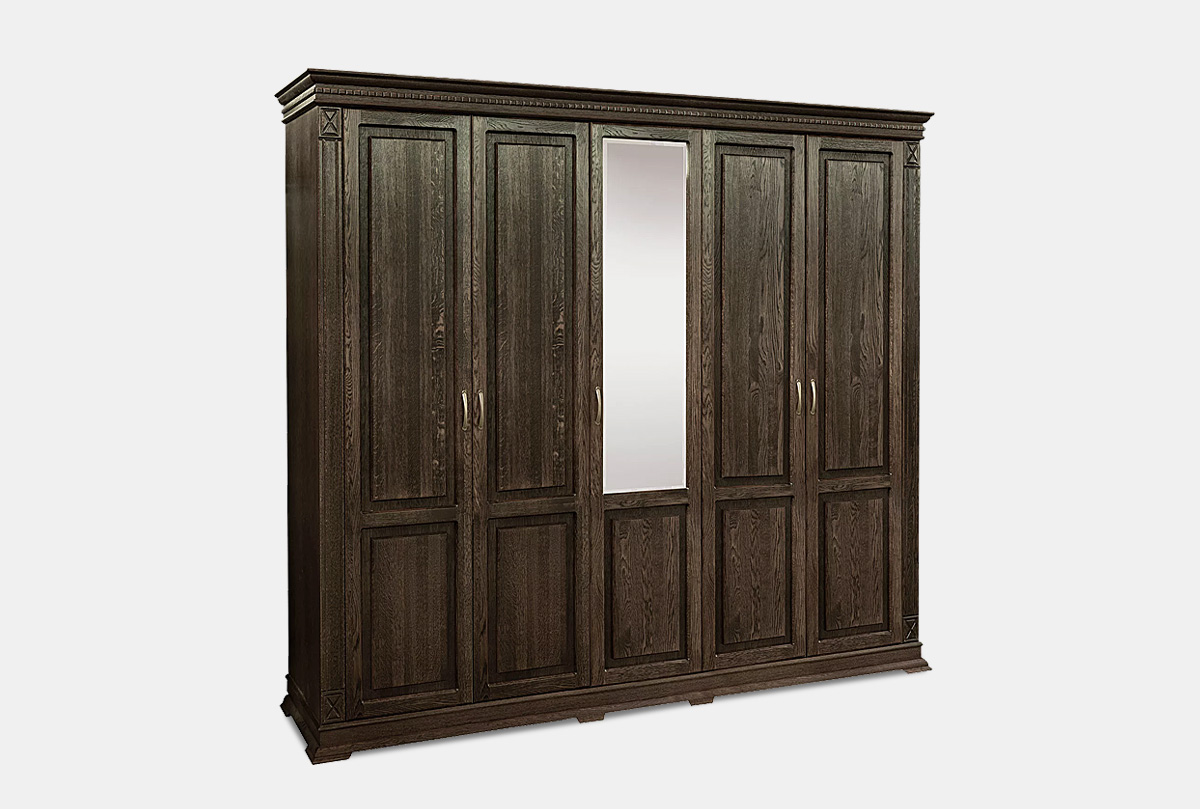 Пятидверный шкаф из коллекции «Верди Люкс» - это идеальный баланс красоты и эргономичности. Утонченность классики представлена в виде фигурного цоколя, резных пилястр и благородных цветов крашения, которые подчеркивают природную красоту дерева. Внутреннее наполнение в виде выдвижных ящиков, полок и штанги для одежды обеспечивают комфорт эксплуатации. Украшение шкафа – зеркало с фацетом, который создает дополнительную игру света.