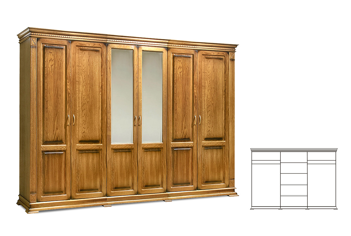 Шестидверный шкаф из коллекции «Верди Люкс» - это идеальный баланс красоты и эргономичности. Утонченность классики представлена в виде фигурного цоколя, резных пилястр и благородных цветов крашения, которые подчеркивают природную красоту дерева. Внутреннее наполнение в виде выдвижных ящиков, полок и штанги для одежды обеспечивают комфорт эксплуатации. Украшение шкафа – зеркало с фацетом, который создает дополнительную игру света.