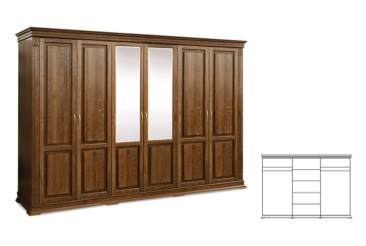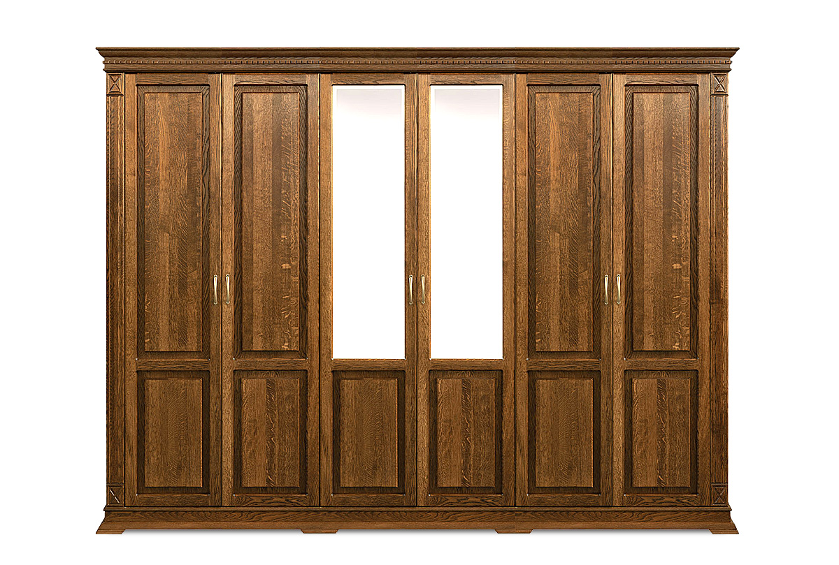 Шестидверный шкаф из коллекции «Верди Люкс» - это идеальный баланс красоты и эргономичности. Утонченность классики представлена в виде фигурного цоколя, резных пилястр и благородных цветов крашения, которые подчеркивают природную красоту дерева. Внутреннее наполнение в виде выдвижных ящиков, полок и штанги для одежды обеспечивают комфорт эксплуатации. Украшение шкафа – зеркало с фацетом, который создает дополнительную игру света.