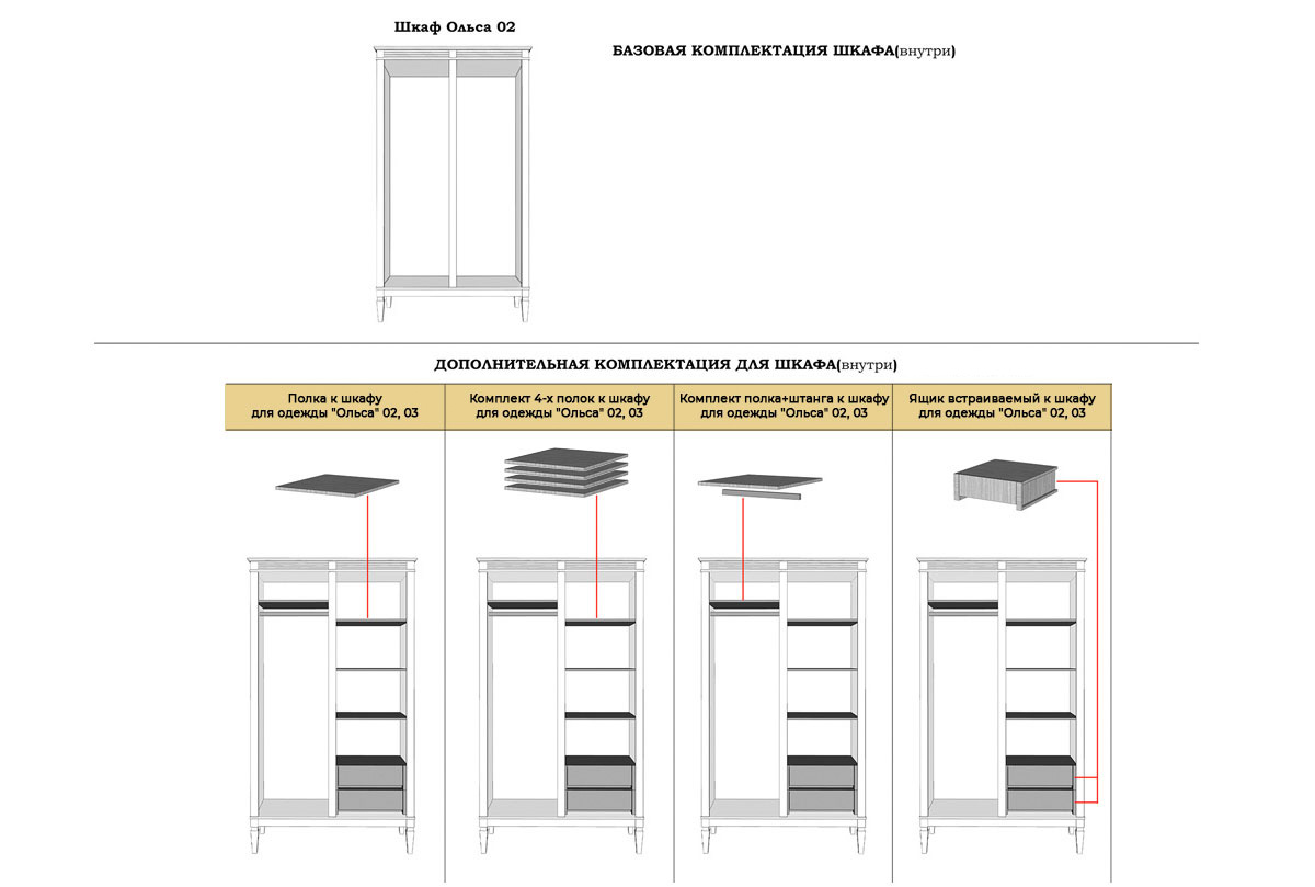 В базовую комплектацию шкафа для одежды 2-х дверного «Ольса» 02 не включены полки, штанги и ящики. Комплектующие для шкафа можно заказать отдельно.