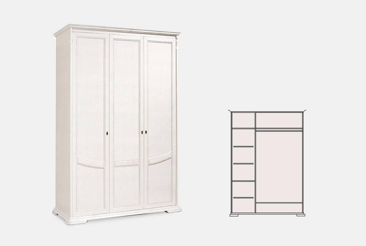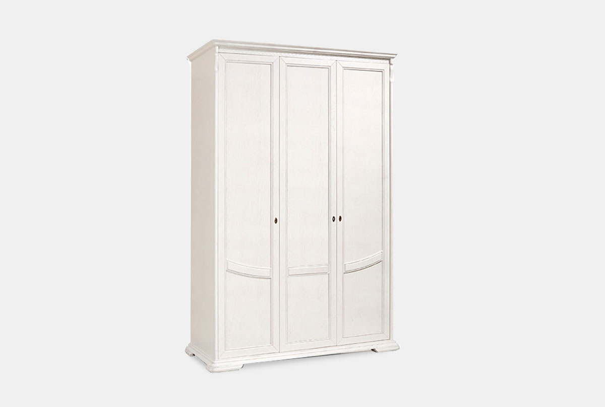 Трехдверный шкаф для одежды «Лика» (без зеркала) в цвете «белая эмаль» – яркий представитель классического стиля. Все дверки закрываются на ключ и не дают возможность пыли попадать в шкаф. Созданный из такого качественного и натурального материала как массив и шпон дуба, трехдверный шкаф Lika для одежды «Лика», как ничто иное способен создать комфорт и уют в спальном помещении.
