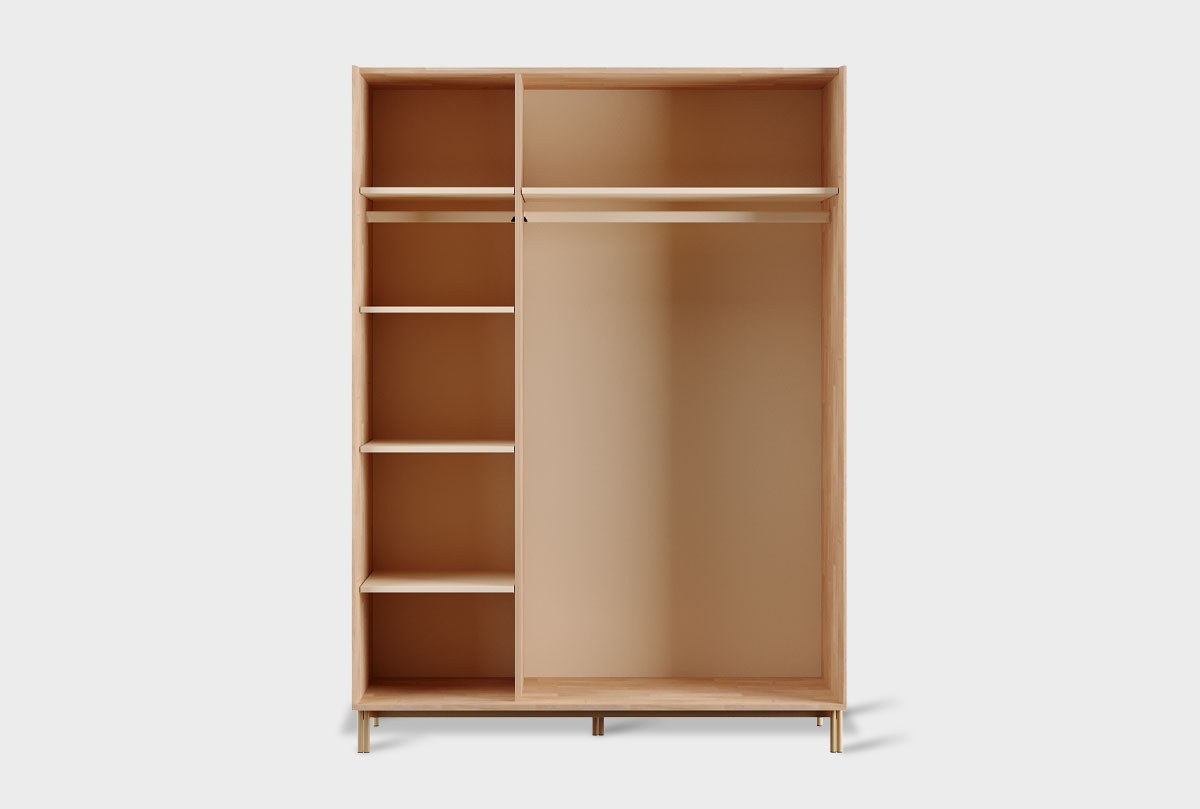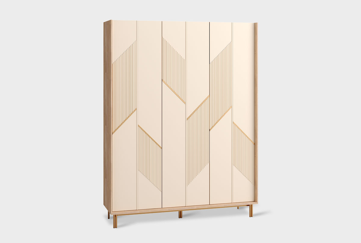 Трехдверный шкаф для одежды Avenue с благородной текстурой натурального дерева, шелковисто-матовыми фасадами и металлическим декором. Опоры также выполнены из металла.