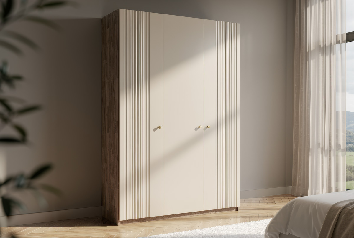 Коллекция «Меридиан» — это искусство современного мебельного дизайна, где каждая линия и текстура несёт смысл. Волнообразные фасады, имитирующие атласную ткань, высокая лёгкость конструкции, минималистичная позолоченная фурнитура — всё это создаёт не просто мебель, а интерьерный акцент, с которым хочется жить.