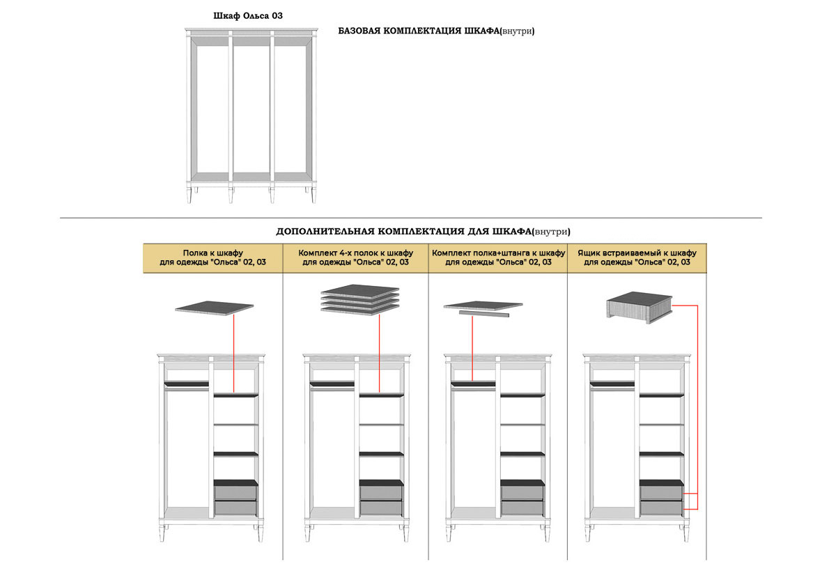 В базовую комплектацию шкафа для одежды 3-х дверного «Ольса» 03 не включены полки, штанги и ящики. Комплектующие для шкафа можно заказать отдельно.
