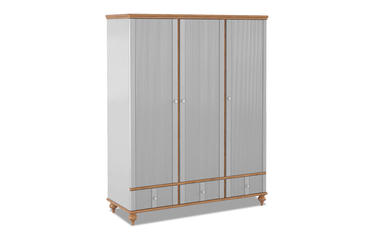 Трехдверный шкаф для одежды «Рандеву» 33 в цвете «серый 7042+антик 24». Размеры (ШxВxГ) 1645 х 2005 х 595. Шкаф оснащен тремя ящиками и тремя штангами. Фурнитура на ящиках с доводчиками. Высокие ножки обеспечивают оптимальный доступ при уборке.