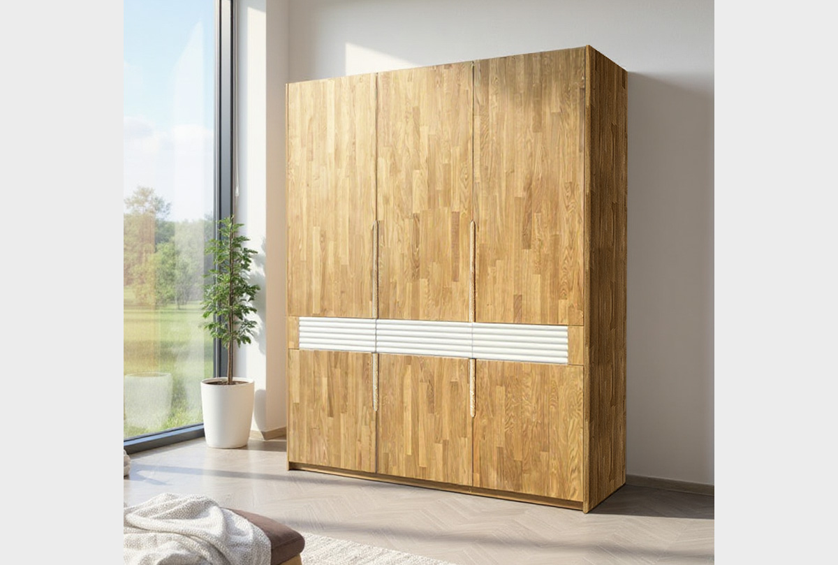 В коллекции представлен трехдверный шкаф для одежды Wallstreet ("Уоллстрит") с сочетанием текстуры натурального дерева и акцентных вставок, который собрал в себя черты современного стиля. Сдержанно-светлая цветовая гамма, упорядоченность внутреннего пространства шкафа, разные фасады или вставки на выбор. Шкаф для одежды Wallstreet благодаря светлым цветам отлично сочетается с другими элементами интерьера спальни, детской, гостиной или прихожей.