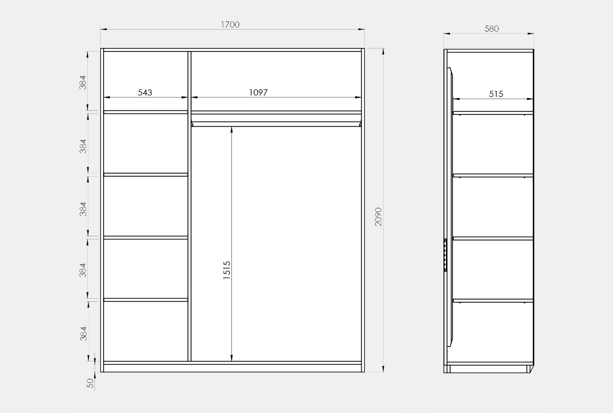 ✅ Размер шкафа для одежды: ширина 1700 мм, высота 2090 мм, глубина 580 мм.