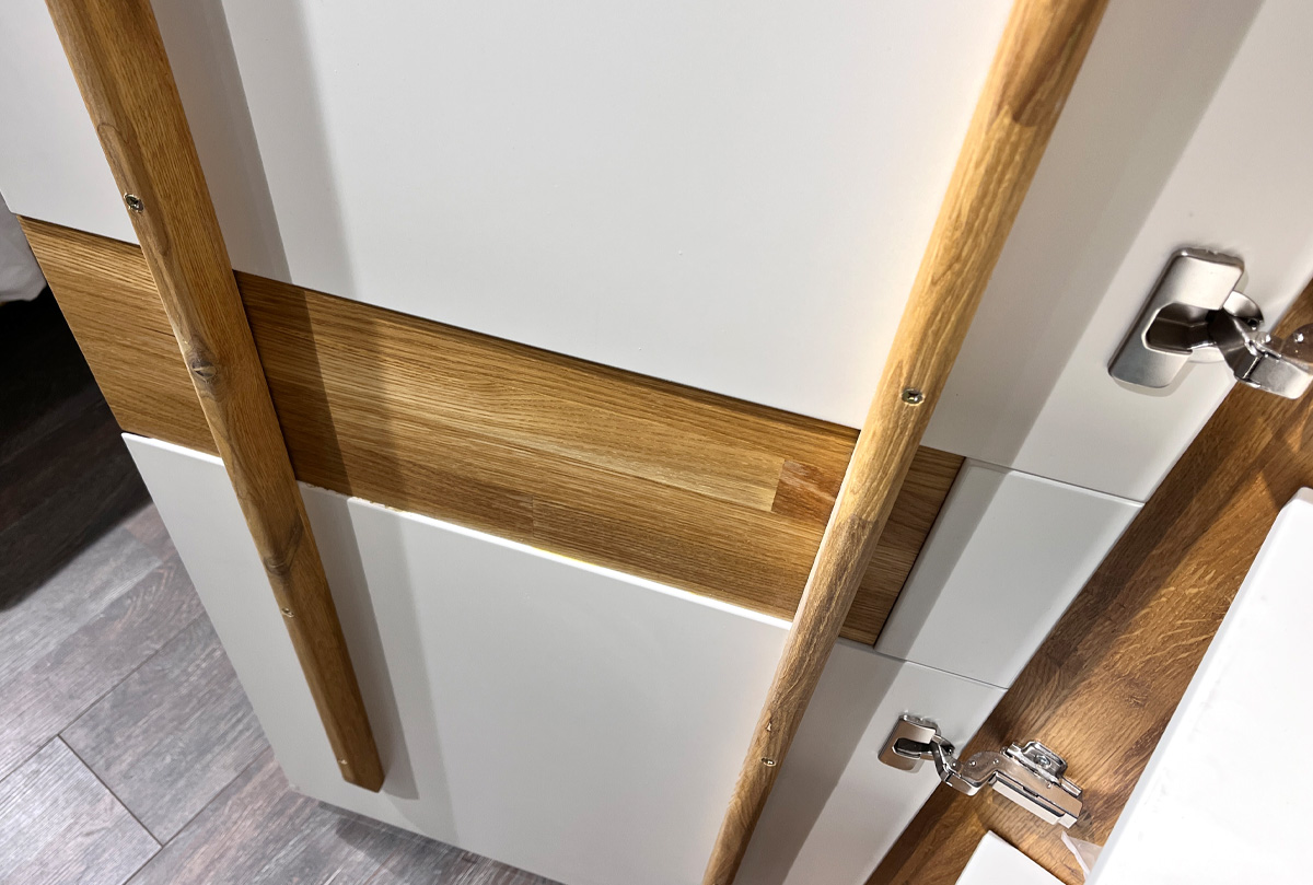 ✅ Шкаф изготовлен из комбинации материалов - массива дуба и эмали. Из массива дерева изготовлен корпус и вставка с фрезеровкой.