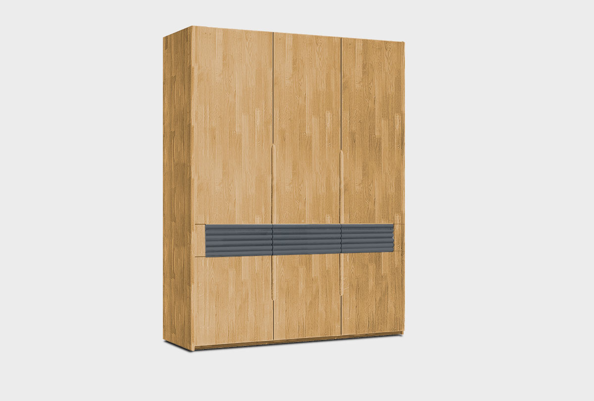 Трехдверный шкаф для одежды Wallstreet в цвете «к-бейц-масло, ф-бейц-масло, вст-антрацит» с сочетанием текстуры натурального дерева и акцентных вставок, который собрал в себя черты современного стиля. Сдержанно-светлая цветовая гамма, упорядоченность внутреннего пространства шкафа. Шкаф для одежды Wallstreet благодаря светлым цветам отлично сочетается с другими элементами интерьера спальни, детской, гостиной или прихожей.
