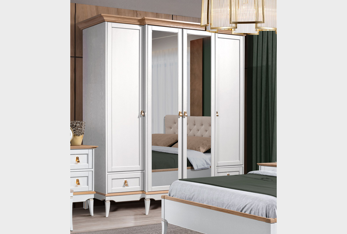 Шкаф для одежды 4-х дверный Стюарт с зеркалом, для Вашей спальни в классическом стиле, в цвете "персидский жемчуг, натуральный дуб".