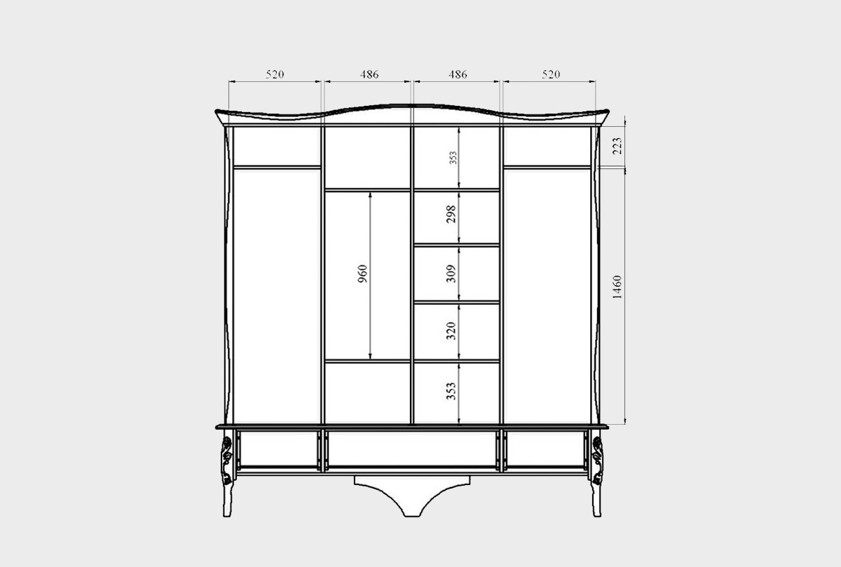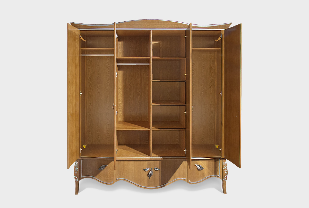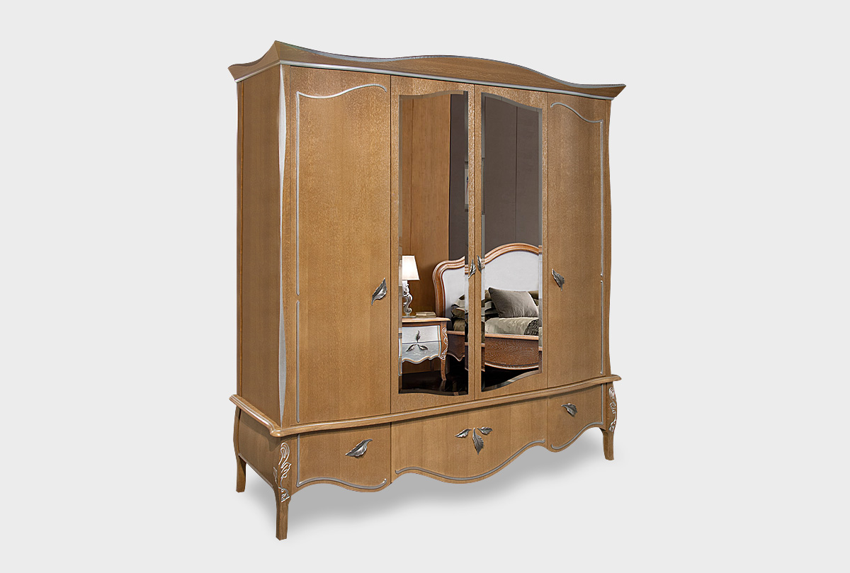 Четырехдверный шкаф из коллекции «Трио» в цвете «коньяк с серебряной патиной+серебро» идеально подойдет для квартиры или загородного дома. Продуманное внутреннее наполнение позволит Вам распределить в нем вещи всей семьи: шкаф содержит три выдвижных ящика, штанги для одежды и полки. Шкаф декорирован резьбой и фурнитурой в виде лепестков. Изюминку дизайну придает волнообразная форма карниза.