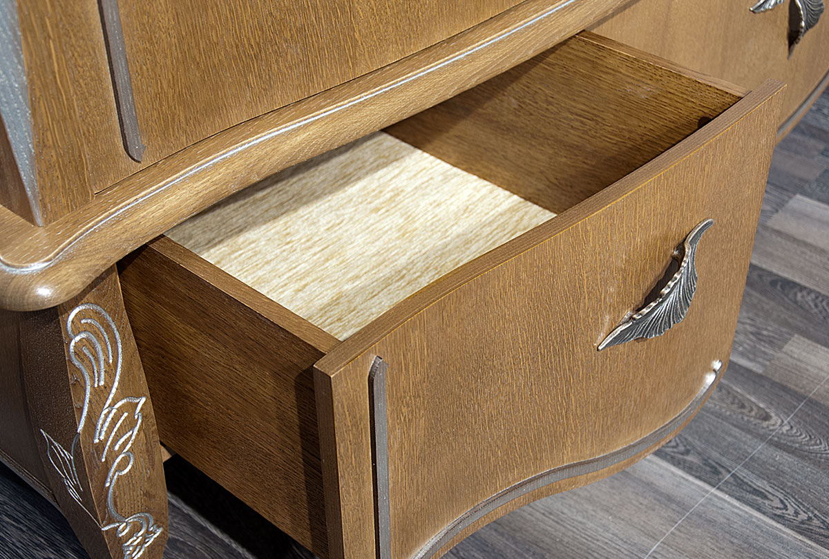 ✅ Изюминку дизайну шкафа придает волнообразная форма карниза из массива дуба с серебряной патиной.