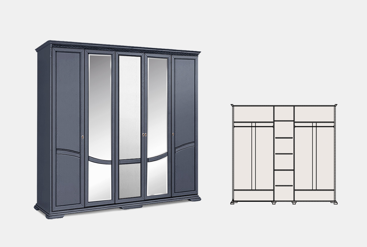 Для ценителей классического стиля прекрасно подойдет вместительный и удобный пятидверный шкаф для одежды из коллекции «Лика». Благодаря продуманной внутренней компоновке, Вы без труда разместите в нем даже самый большой гардероб. Шкаф оснащен двумя отделениями со штангой, а так же вместительными полками. Для дополнительного комфорта хранения дверцы закрываются на ключ. Шкаф Lika выполнен из натурального массива и шпона дуба, в цвете «изабелла с темной патиной».