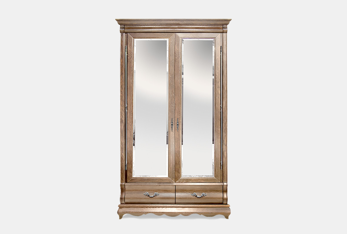 Добротный, но в тоже время изящный двухдверный шкаф для одежды «Оскар» в цвете «амбэр с белой патиной» с зеркальными дверками прекрасно подойдет к классическому и современному интерьеру. Шкаф оснащен выдвижными ящиками, отделением со штангой с левой стороны, а с правой разместились полки. На дверцах расположены зеркала, что обеспечивает дополнительное удобство. Массивный карниз, нарядная «юбка», утонченная фурнитура и художественная резьба на фасадах – все это придает особый шарм этому шкафу. Шкаф выполнен из массива дуба.