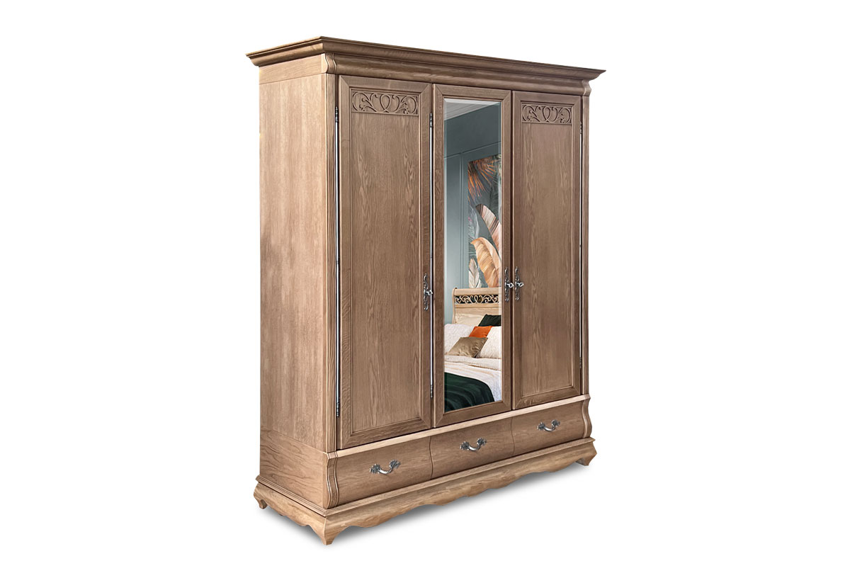 Элегантный трехдверный шкаф для одежды «Оскар» с зеркалом в цвете «классик» выполнен из массива дуба. Изящные изгибы, зеркало на центральной створке, со вкусом подобранная фурнитура придают его виду благородство..