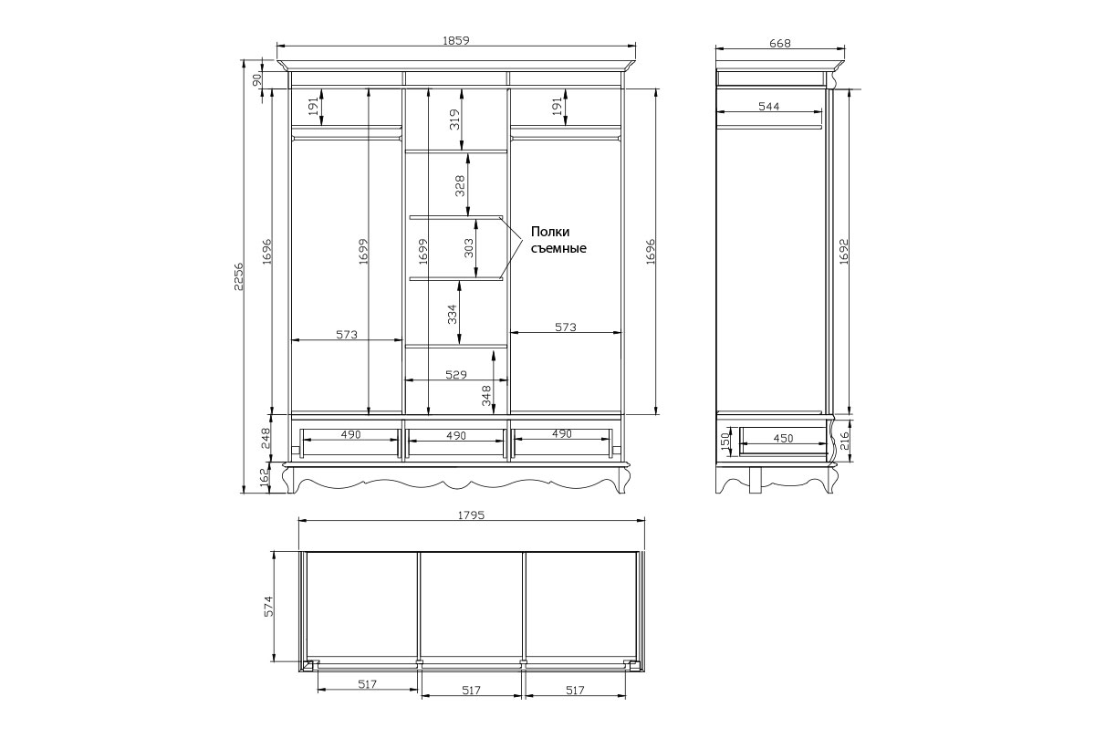 ✅ Съемные полки в центральной части и штанги для одежды по бокам.