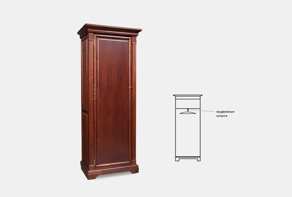 В коллекции натуральной мебели "Престиж" есть изящный и при этом весьма практичный однодверный шкаф для одежды. Величественный, стремящийся ввысь шкаф поможет оптимально расходовать свободное место в гостиной или спальне. Эта роскошная модель из коллекции "Престиж" сделана из массива и шпона берёзы.