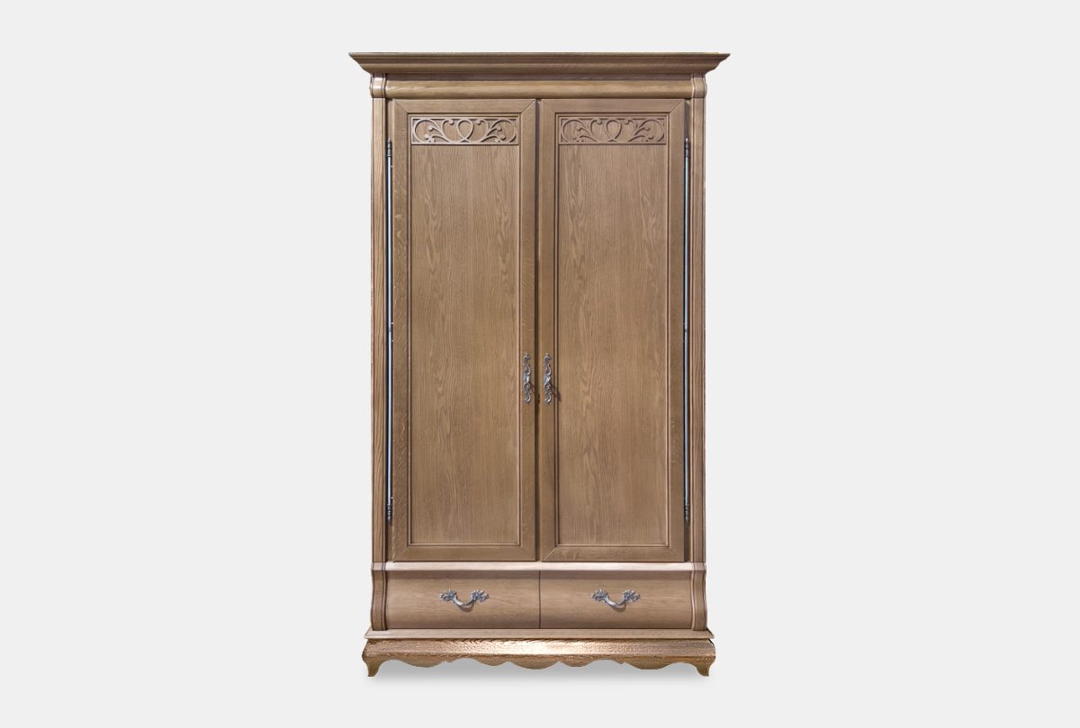 Изящный двухдверный шкаф для одежды «Тэфи» в цвете «классик» прекрасно подойдет к классическому и современному интерьеру. Шкаф оснащен выдвижными ящиками, отделением со штангой с левой стороны, а с правой разместились полки. Массивный карниз, нарядная «юбка», утонченная фурнитура и художественная резьба на фасадах – все это придает особый шарм этому шкафу.