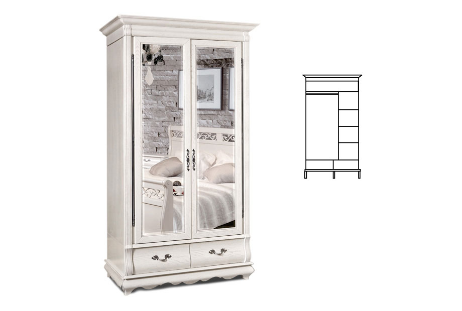 Добротный, но в тоже время изящный двухдверный шкаф для одежды «Тэфи» с зеркальными дверками в цвете «белая эмаль с темной патиной» прекрасно подойдет к классическому и современному интерьеру. Шкаф оснащен выдвижными ящиками, отделением со штангой с левой стороны, а с правой разместились полки. На дверцах расположены зеркала, что обеспечивает дополнительное удобство. Массивный карниз, нарядная «юбка», утонченная фурнитура и художественная резьба на фасадах – все это придает особый шарм этому шкафу. Он выполнен из массива дуба, который может быть окрашен в строгий «классик», нежный оттенок «белая эмаль с темной патиной» или уникальный «амбэр с белой патиной».