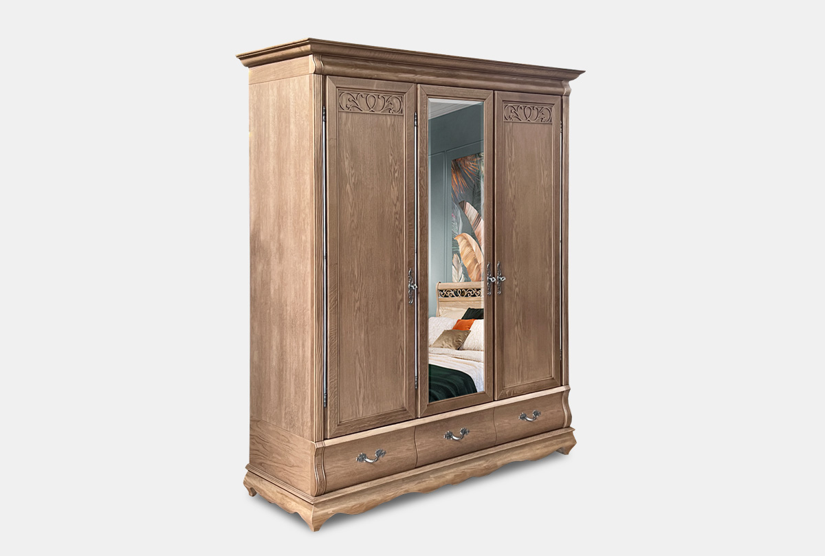 Элегантный трехдверный шкаф для одежды «Тэфи» с зеркалом в цвете «классик» выполнен из массива дуба. Изящные изгибы, зеркало на центральной створке, со вкусом подобранная фурнитура придают его виду благородство. Зрительно не стесняя пространство, шкафы цвета «белая эмаль с темной патиной» создают в помещении легкую и умиротворенную обстановку. Также неординарно выглядит шкаф в цветах «амбэр с белой патиной» и «классик».
