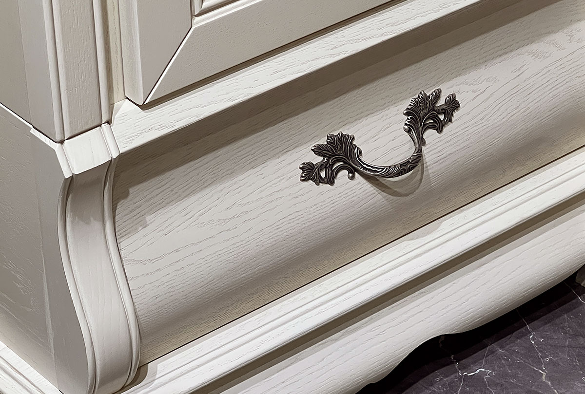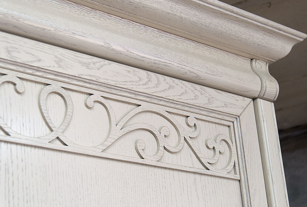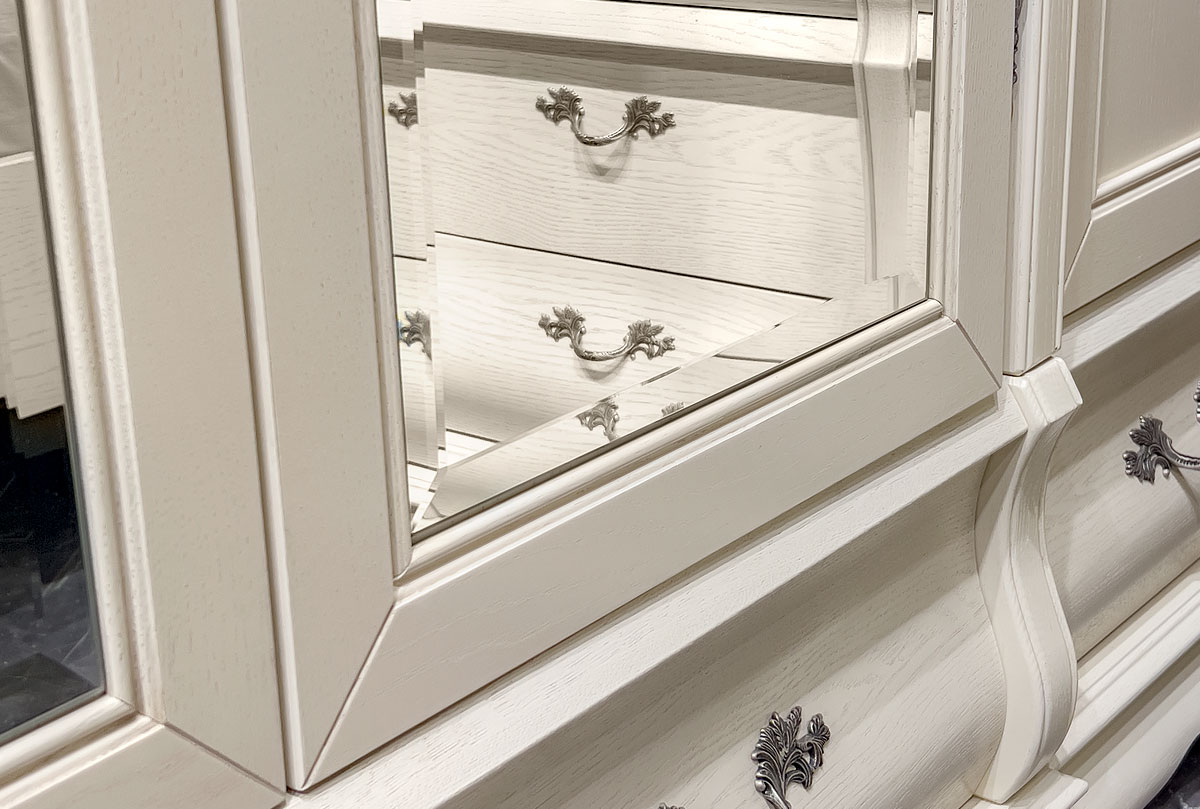 Элегантный четырехдверный шкаф для одежды «Тэфи» с зеркалом в цвете «белая эмаль с темной патиной» выполнен из массива дуба. Четко выделенные линии дверей, зеркало на центральной створке, имитирующее ручную работу старинных мастеров и точеные металлические ручки придают его виду благородство. Зрительно расширяя пространство, белые шкафы создают в помещении легкую и умиротворенную обстановку.