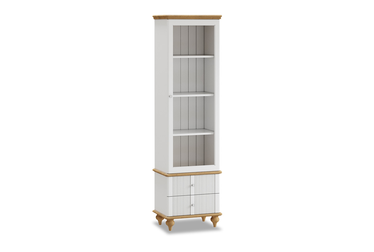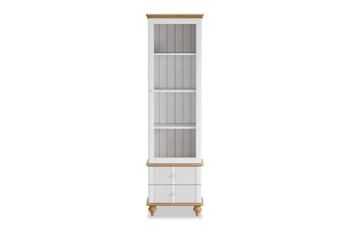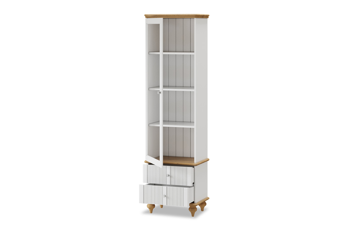 Однодверный шкаф для посуды «Рандеву» 12 в цвете «белый лак+антик 24» из массива сосны и стекла. Представляет собой высокий шкаф с распашной, стеклянной дверью. Снизу два выдвижных ящика. с доводчиками. Высокие ножки обеспечивают оптимальный доступ при уборке.