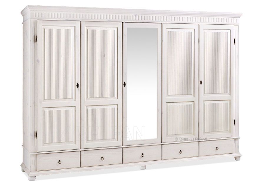 Шкаф «Хельсинки-5-SP-GT-M» (Helsinki) с зеркалом и 5 распашными дверями надежно сохранит вещи для всей семьи. На одну из дверей установлено зеркало в полный рост. Внутри: два отделения для одежды со штангами, несколько полок для остальных вещей и головных уборов. Под каждой дверью находится выдвижной ящик.