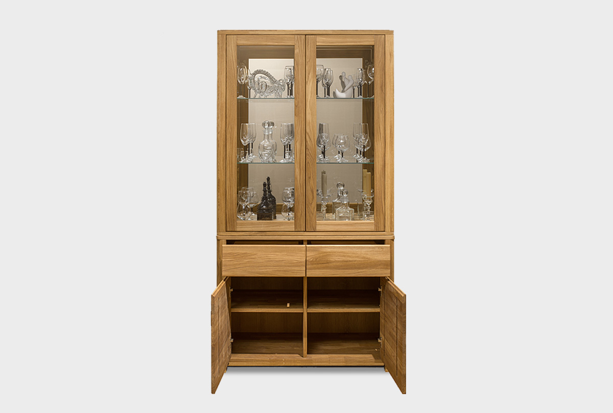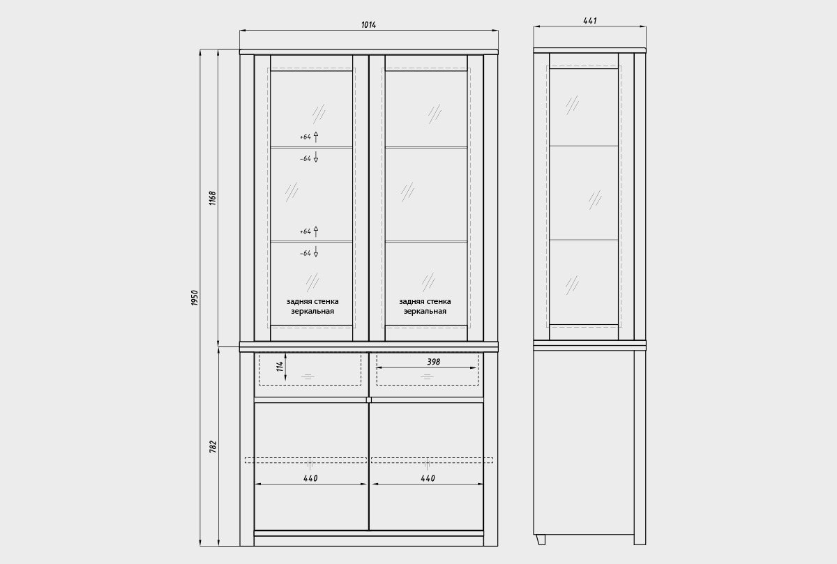 ✅ Шкаф состоит из 2 секций: верхней надставки витрины и функциональной 2-х дверной тумбой.