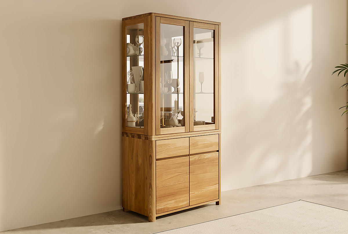 ✅ Шкаф состоит из 2 секций: верхней надставки витрины и функциональной 2-х дверной тумбой.