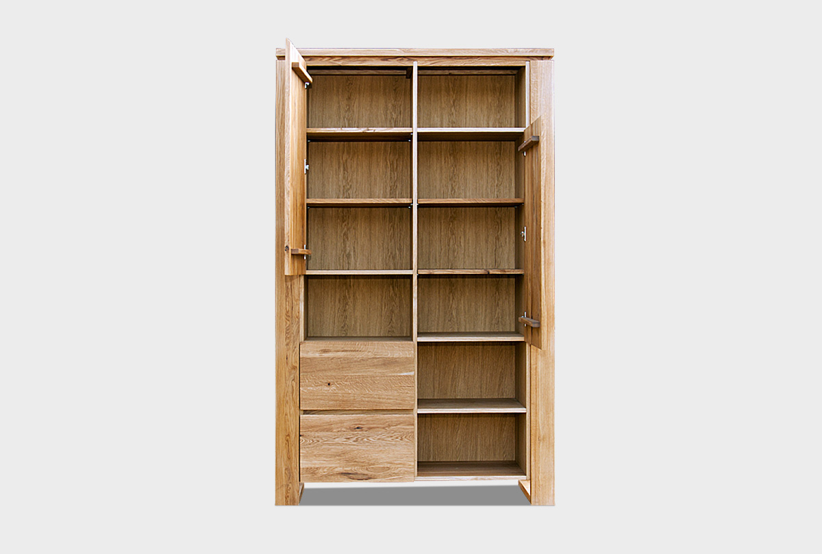 Оригинальным решением в исполнении комбинированного шкафа «Берген» В-224 в цвете «бейц-масло, графит» стала комбинация открытых ниш и закрытых отделений с полками. Свойственное стилю Лофт отсутствие фурнитуры никак не сказалось на функциональности, фасады оборудованы специальными углублениями, благодаря чему дверцы и ящики легко открывать. Шкаф выполнен из натурального дуба, обработанного бейц-маслом.