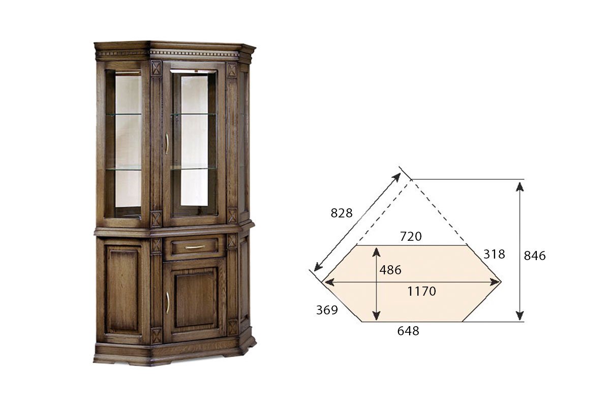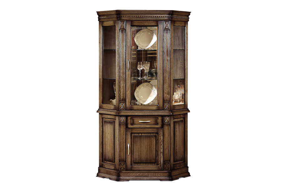 Угловой шкаф из коллекции «Верди» - это стильное решение для интерьера, оформленного в классическом стиле. Стеклянные фасады в сочетании с зеркальными полками и задней стенкой создадут красивую игру света. Благодаря этому, хрустальные бокалы, которые Вы можете поставить на полки, заиграют новыми красками. В выдвижном ящике и нише за дверцей Вы сможете спрятать личные вещи и легко поддерживать порядок в комнате. Декоративные элементы в виде резных пилястр и фигурного цоколя придают шкафу торжественности и утонченности, свойственных классике.