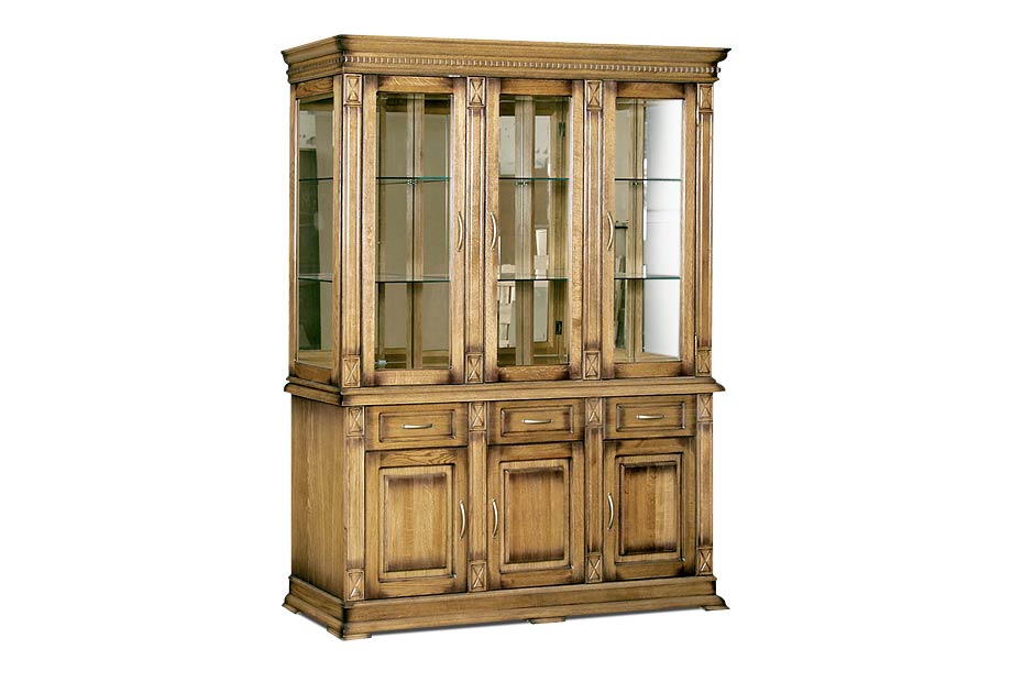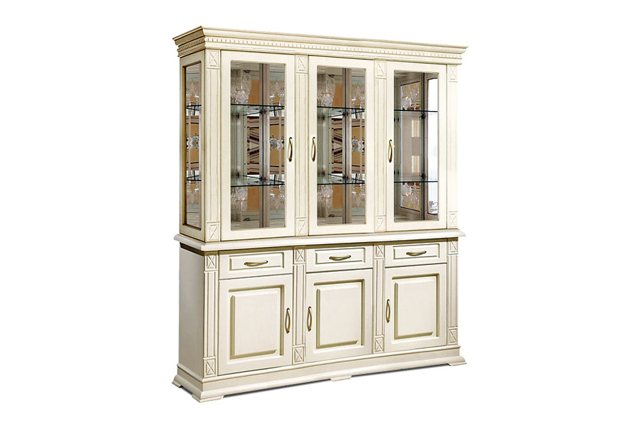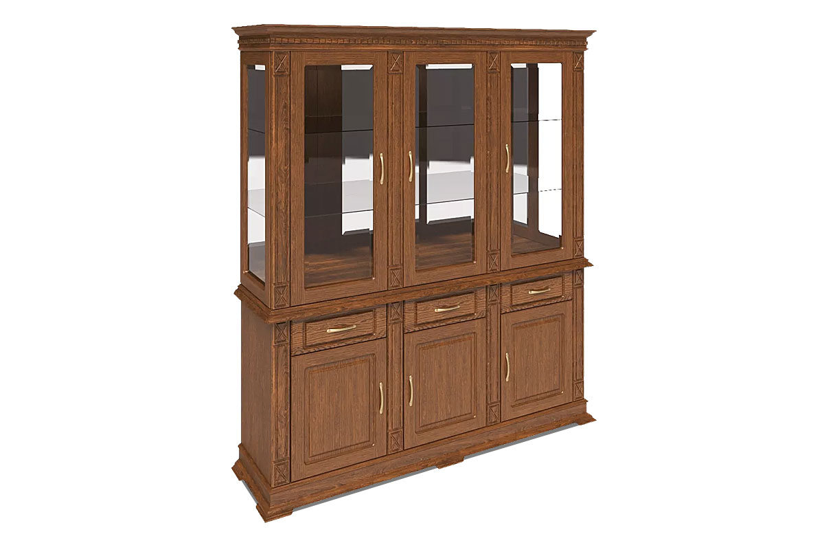 Большой комбинированный шкаф из коллекции «Верди Люкс» - это стильное решение для интерьера, оформленного в классическом стиле. Стеклянные фасады в сочетании с зеркальными полками и задней стенкой создадут красивую игру света. Благодаря этому, хрустальные бокалы, которые Вы можете поставить на полки, заиграют новыми красками. В выдвижных ящиках и нишах за дверцами Вы сможете спрятать личные вещи и легко поддерживать порядок в комнате. Декоративные элементы в виде резных пилястр и фигурного цоколя придают шкафу торжественности и утонченности, свойственных классике.
