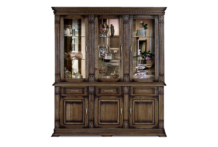Большой комбинированный шкаф из коллекции «Верди Люкс» - это стильное решение для интерьера, оформленного в классическом стиле. Стеклянные фасады в сочетании с зеркальными полками и задней стенкой создадут красивую игру света. Благодаря этому, хрустальные бокалы, которые Вы можете поставить на полки, заиграют новыми красками. В выдвижных ящиках и нишах за дверцами Вы сможете спрятать личные вещи и легко поддерживать порядок в комнате. Декоративные элементы в виде резных пилястр и фигурного цоколя придают шкафу торжественности и утонченности, свойственных классике.