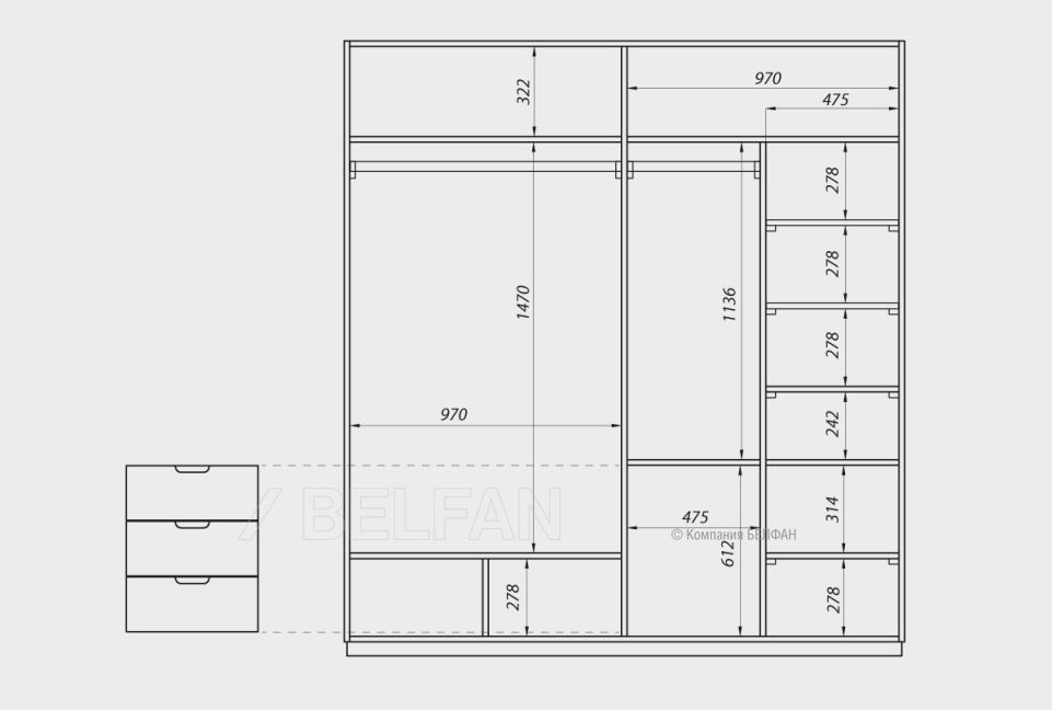 ✅ Внутренний встроенный комод на 3 ящика — отличное решение для белья и мелочей.