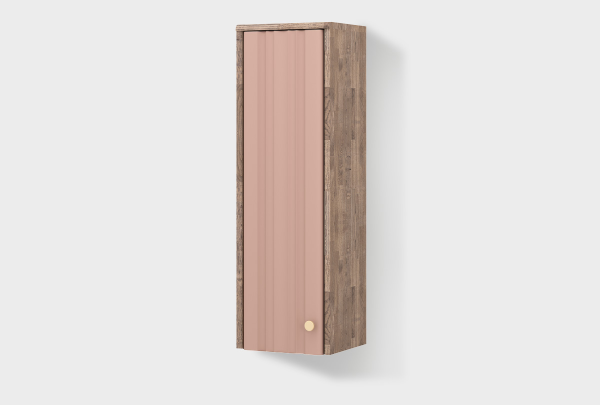 Шкаф настенный «Меридиан» (левый) изготовлен из дуба. Корпус выполнен в цвете «торфяной дуб», а фасад в оттенке «дымчатая роза».