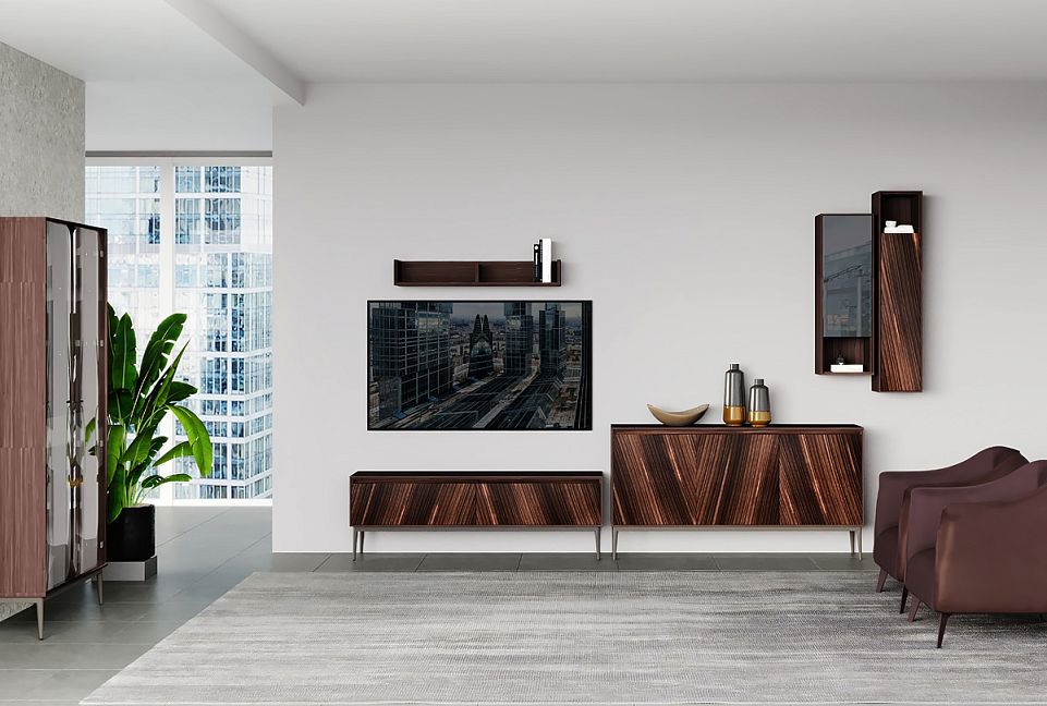 ✅ Акцентные фасады с ярким рисунком благородного кедрового шпона, расположенного под углом в 45 градусов, что придает изделию уникальный вид.