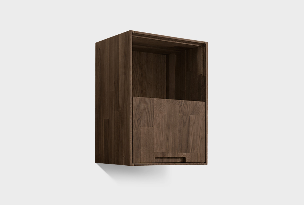 Навесной шкаф «Ирвинг» 60 визуально не перегружает интерьер. Благодаря универсальной геометрии и выразительной текстуре дуба, он легко сочетается с другими элементами коллекции. Идеально подходит для размещения над тумбой или комодом. Также можно использовать как элемент навесной модульной композиции на стене.