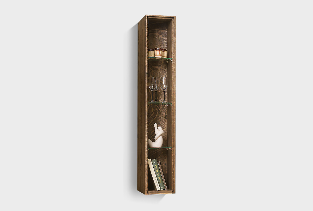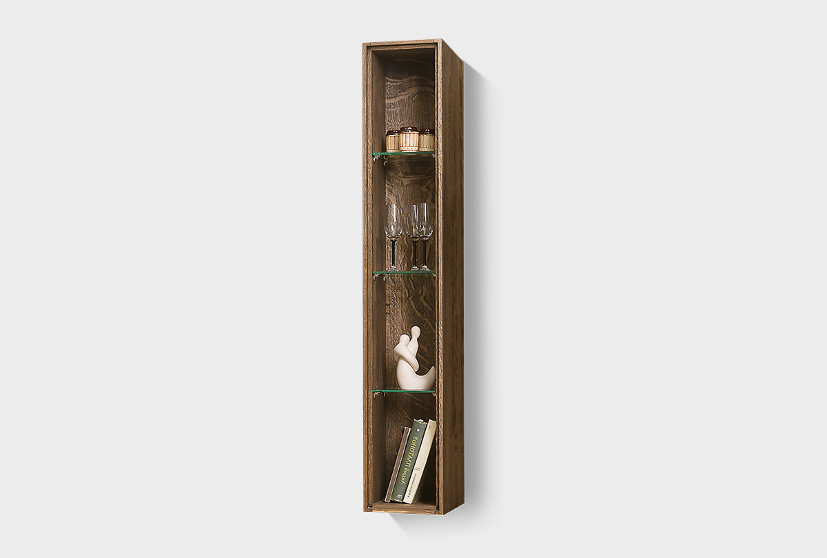 Навесной узкий шкаф «Ирвинг» 4 (стекло) продолжает эстетику коллекции — он кажется невесомым, но на деле остаётся надёжным и вместительным. Выполненный из массива дуба, он сочетает в себе прочность натурального дерева и воздушность благодаря открытому фасаду и стеклянным полкам.
