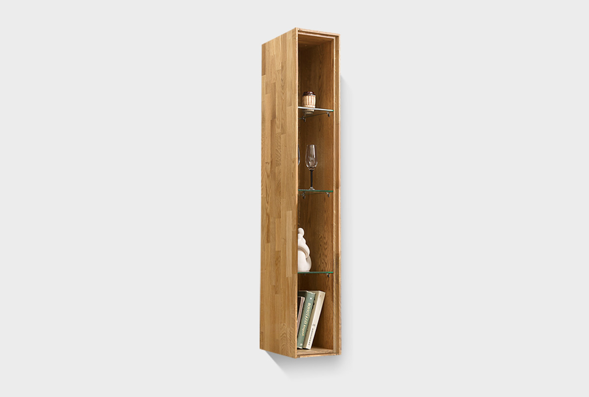 Навесной узкий шкаф «Ирвинг» 4 (стекло) продолжает эстетику коллекции — он кажется невесомым, но на деле остаётся надёжным и вместительным. Выполненный из массива дуба, он сочетает в себе прочность натурального дерева и воздушность благодаря открытому фасаду и стеклянным полкам.