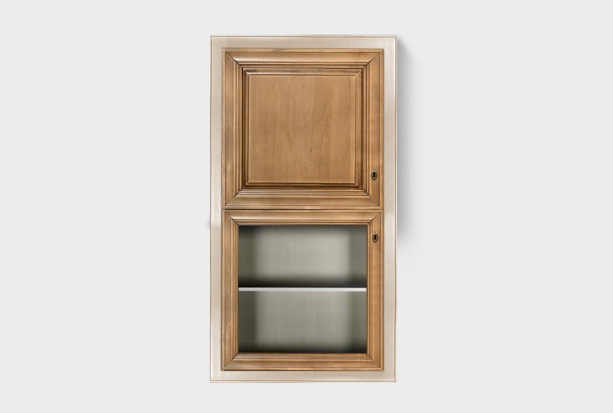 Закрытый навесной шкаф «Оливия» в цвете «пудра» выполнен в классическом стиле из массива и шпона ольхи.