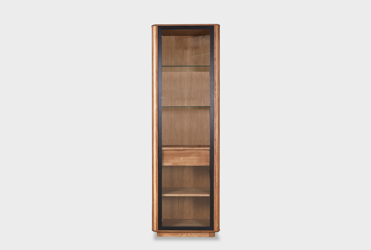 Фасад из тонированного стекла позволяет любоваться содержимым, а внутренний выдвижной ящик добавляет удобства для хранения. Контраст чёрной рамки и природного дуба создаёт динамику и современный ритм, который оживляет помещение, не нарушая его спокойствия.