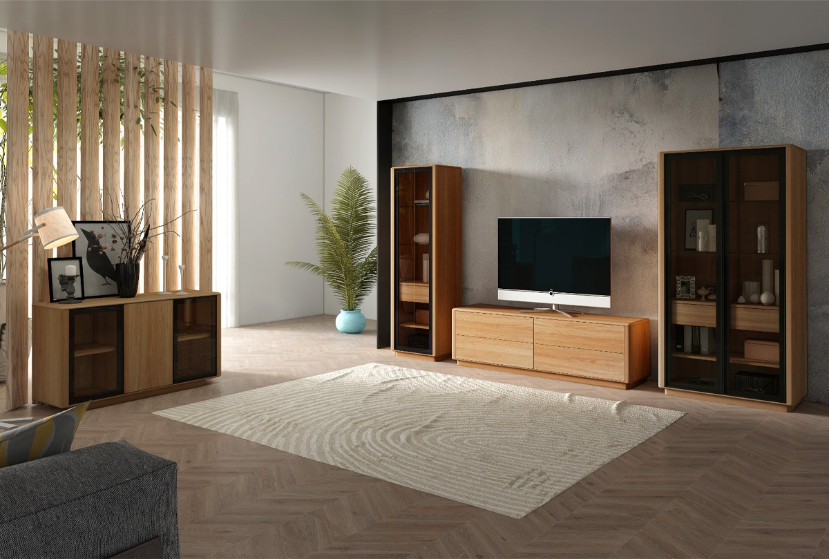 Фасад из тонированного стекла позволяет любоваться содержимым, а внутренний выдвижной ящик добавляет удобства для хранения. Контраст чёрной рамки и природного дуба создаёт динамику и современный ритм, который оживляет помещение, не нарушая его спокойствия.