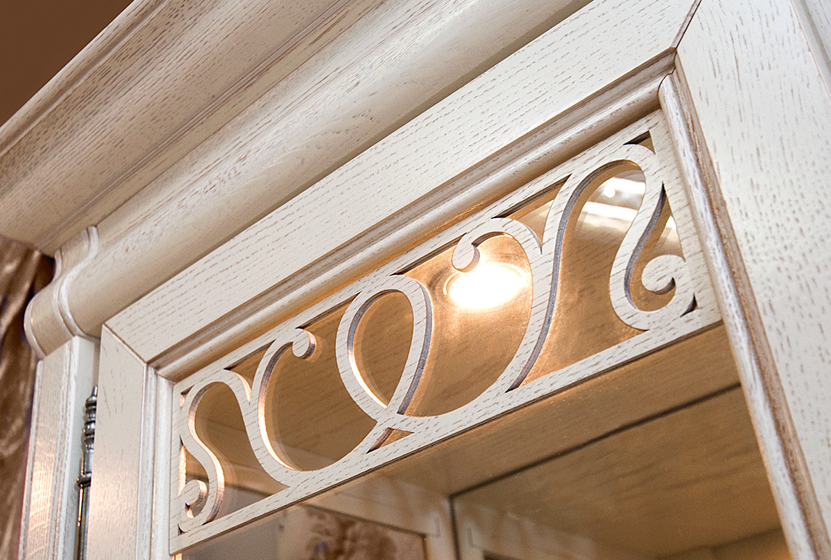 Сделанный из массива дуба однодверный шкаф с витриной «Тэфи» демонстрирует ясные гармоничные пропорции, при этом его вид достаточно компактен. Благодаря внутренней подсветке помещенные в шкаф изысканные сервизы заиграют всеми гранями, а на фоне деликатного велюра, которым обита внутренняя поверхность ящиков, сиянье столовых приборов станет еще ярче. Разнообразие расцветок («амбэр с белой патиной», «классик» или «белая эмаль») позволят подобрать наилучший вариант для гостиной, кухни или столовой. Для того, чтобы оптимально разместить шкаф с витриной в вашем интерьере, выберите нужное вам исполнение (правое или левое).
