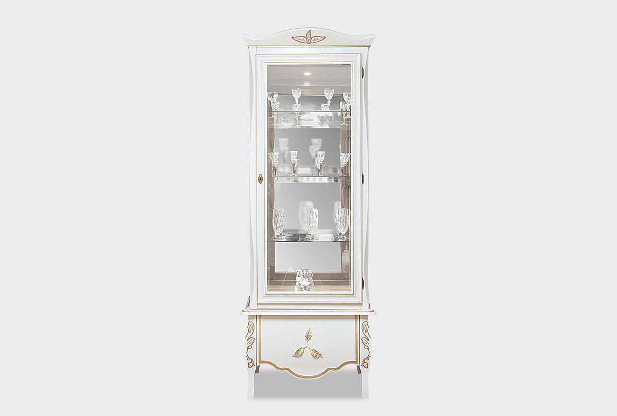 Однодверный правый шкаф с витриной из коллекции «Трио» в цвете «белая эмаль с золотой патиной» из массива и шпона дуба порадует любителей основательных и массивных форм, но в то же время – изящества и декоративности. Изделие идеально сочетает в себе эстетику и практичность и идеально впишется как в гостиную, так и в столовую. В шкафу Вы можете хранить посуду, сувениры, расставить рамки с фотографиями или книги. Он оснащен подсветкой, которая красиво отражается в зеркальной задней поверхности, а стеклянные боковые стенки дополняют образ и делают его более легким и изящным.