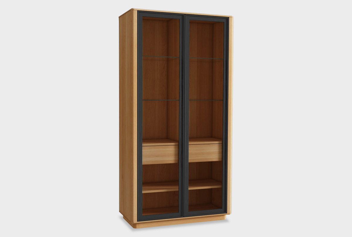Шкаф с витриной «Origin» (2-х дверный) — это элегантный элемент интерьера, который привносит в дом лёгкость и стиль. Две стеклянные двери с тонкой графичной рамкой создают эффект прозрачности, благодаря чему предметы внутри выглядят как часть интерьерной композиции. Пропорции тщательно выверены — высокий корпус визуально вытягивает пространство, сохраняя ощущение воздушности.